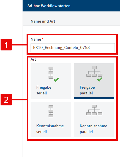 2 Art des Ad-hoc-Workflows: Serielle Workflows werden nacheinander an die zuständigen Personen geleitet. Parallele Workflows erhalten alle beteiligten Personen gleichzeitig.