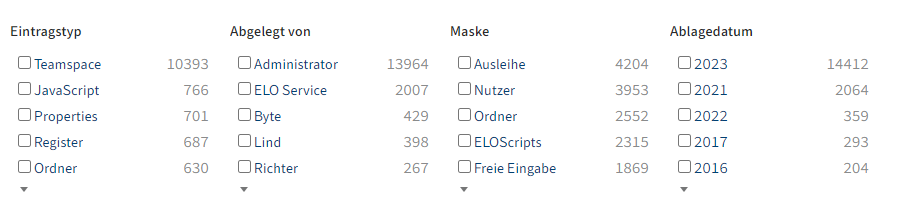 Über Filter bzw. Facetten grenzen Sie die Suche mithilfe von Metadaten ein, etwa dem Ablagedatum.